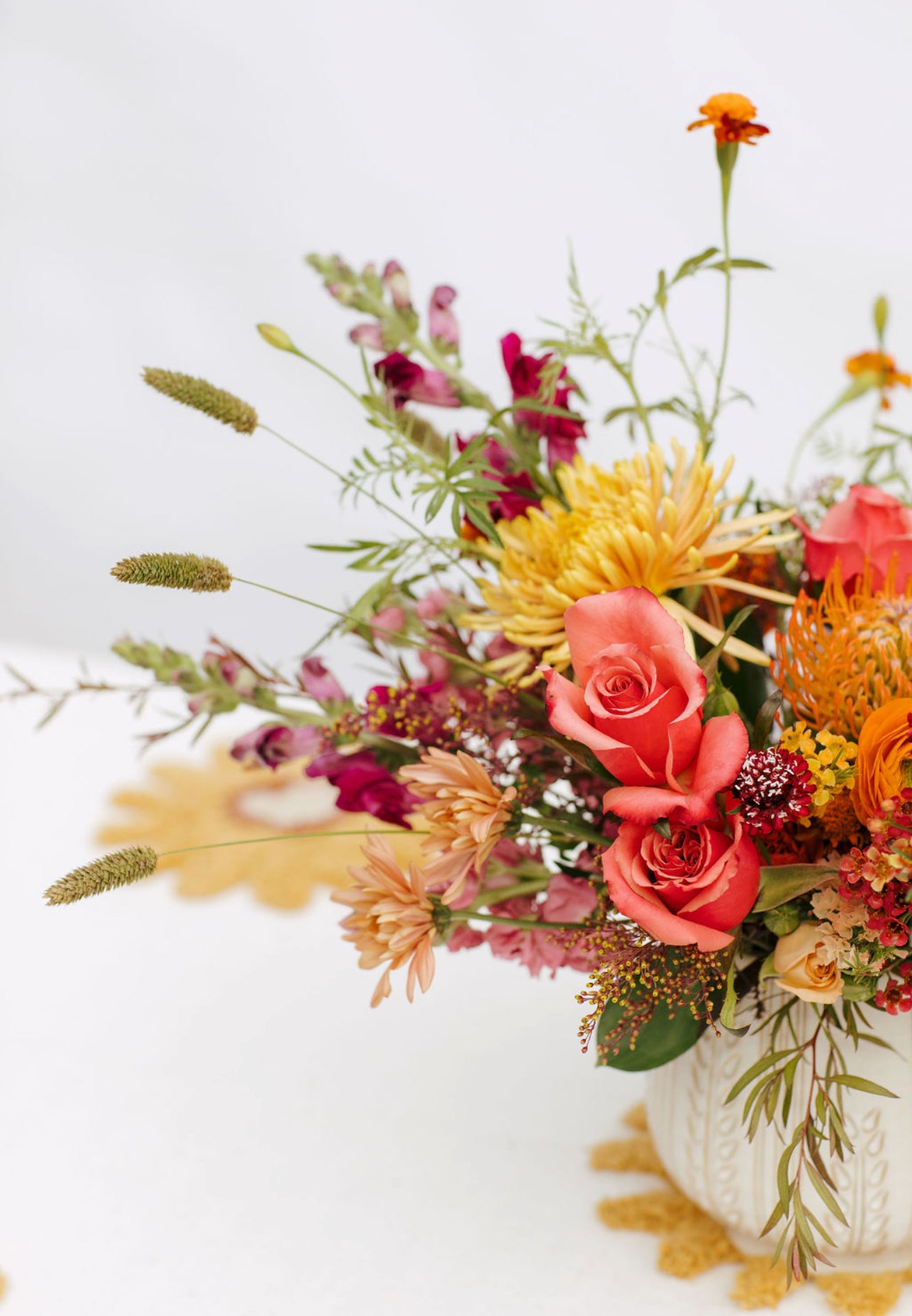 A lush, vase arrangement in our rich, Fall color palette featuring blooms such as protea, mums, dahlia, roses, marigolds, ranunculus etc. Blooms may vary based on availability. Arrangement pictured is “Full”